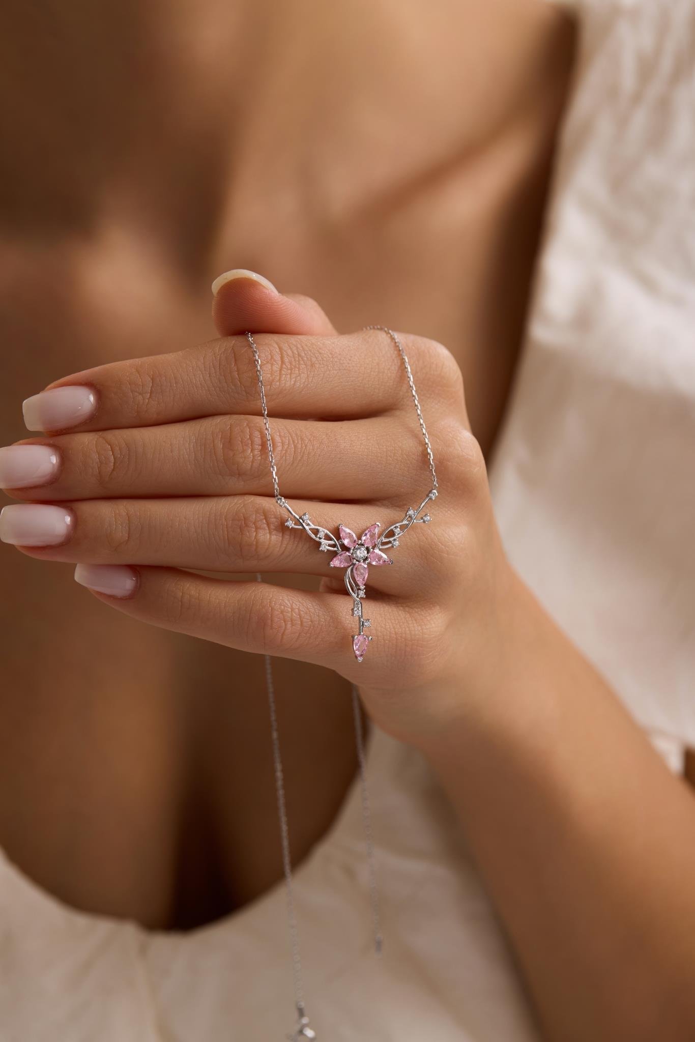 925 Ayar Gümüş Pembe Taşlı Sarmaşık Model Yıldız Detaylı Kolye