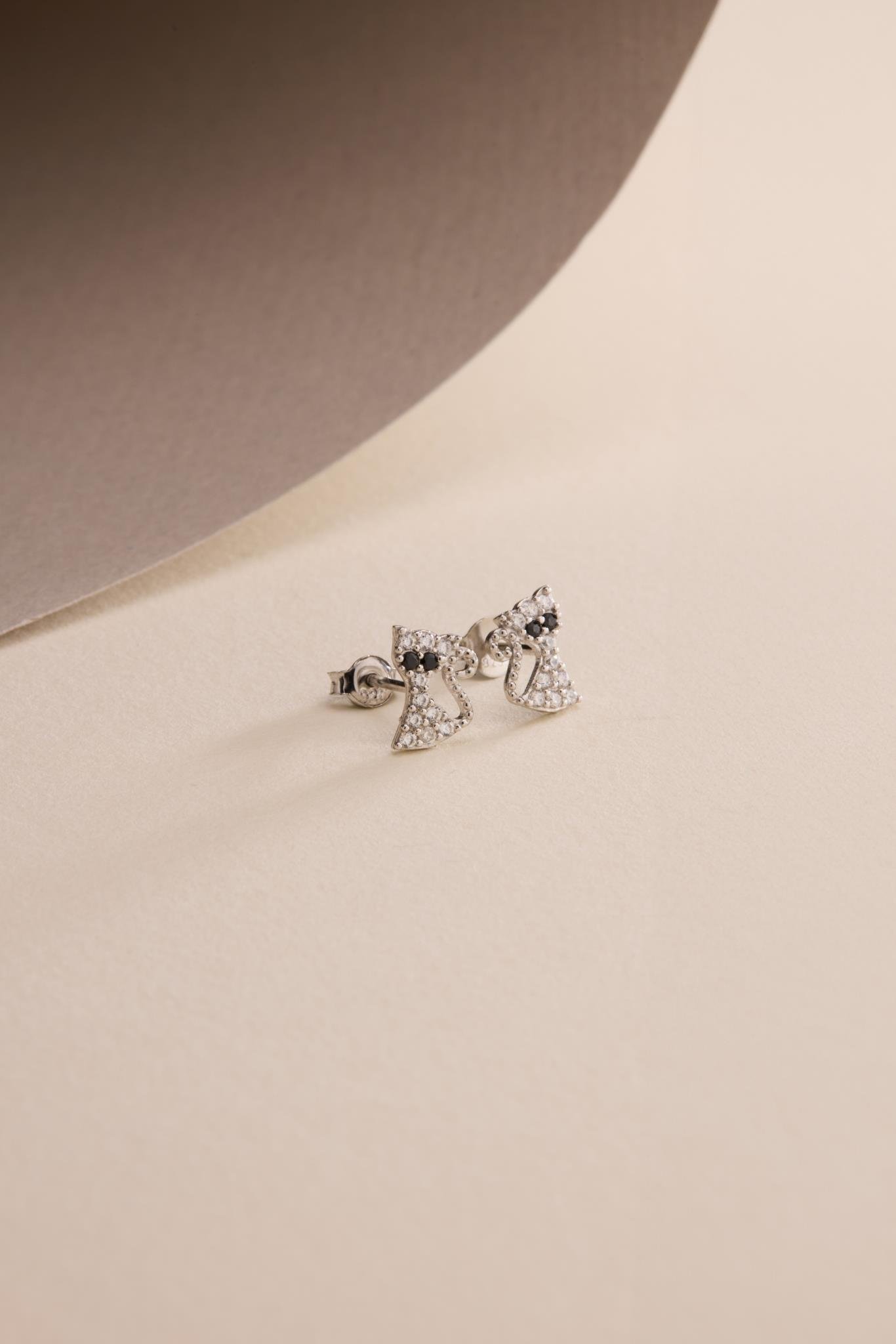 925 Ayar Gümüş Rodyum Kaplama Minik Beyaz Taşlı Kedi Küpe