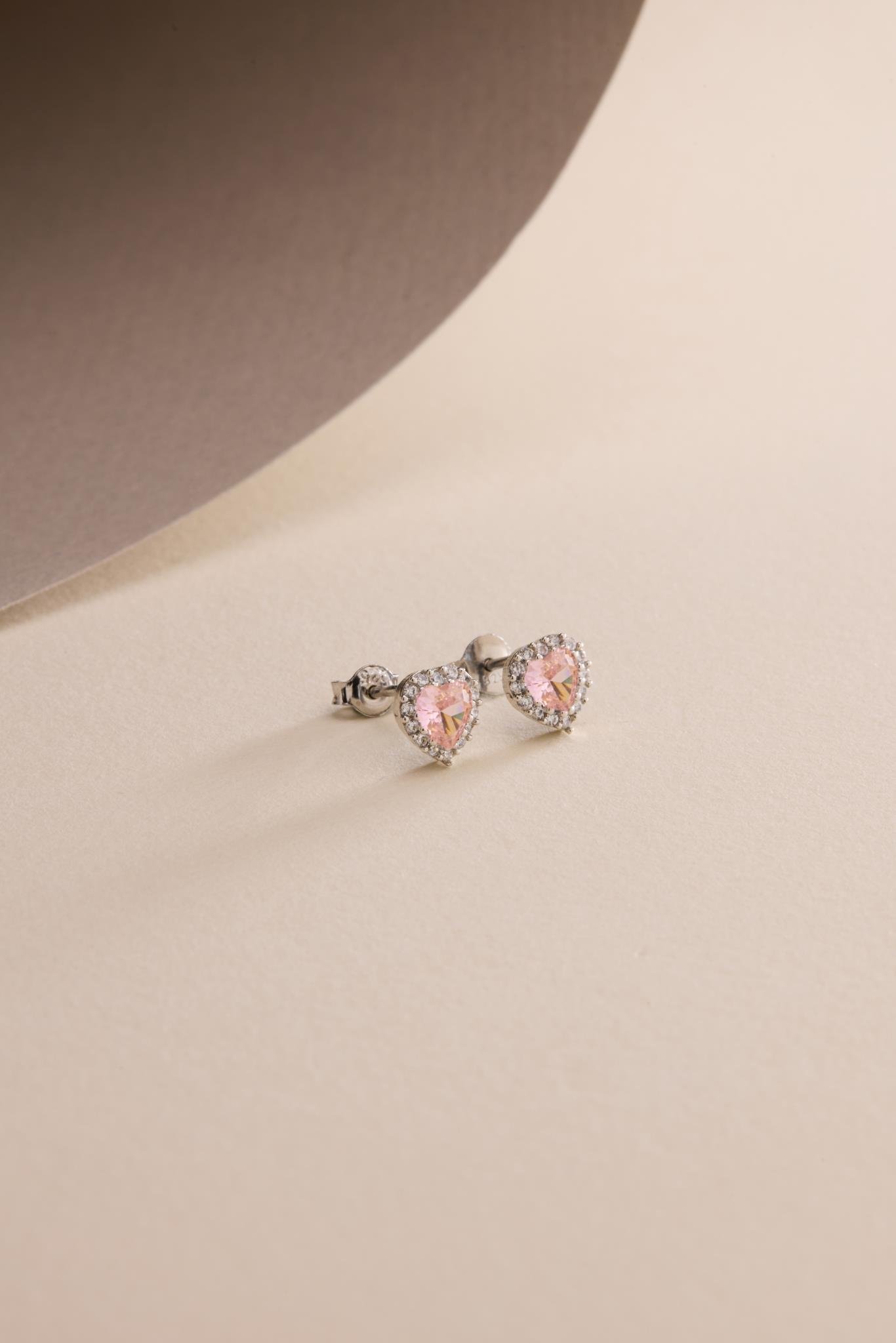 925 Ayar Gümüş Rodyum Kaplama Pembe Taşlı Kalp Model Küpe