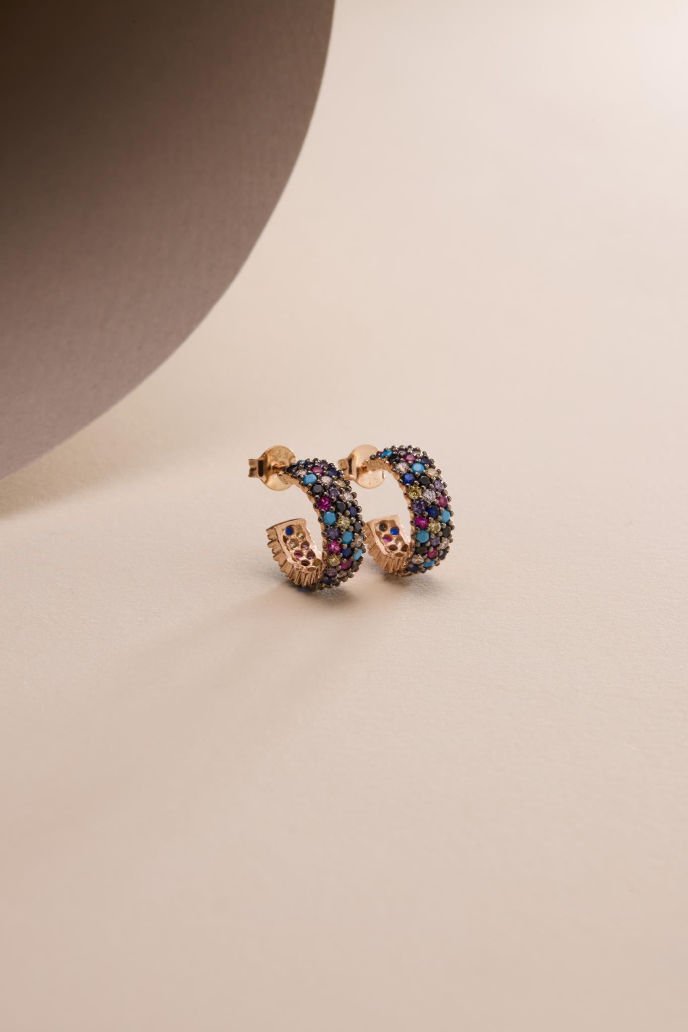 925 Ayar Gümüş Rose Kaplama 3 Sıra Mix Taşlı Yarım Tur Küpe