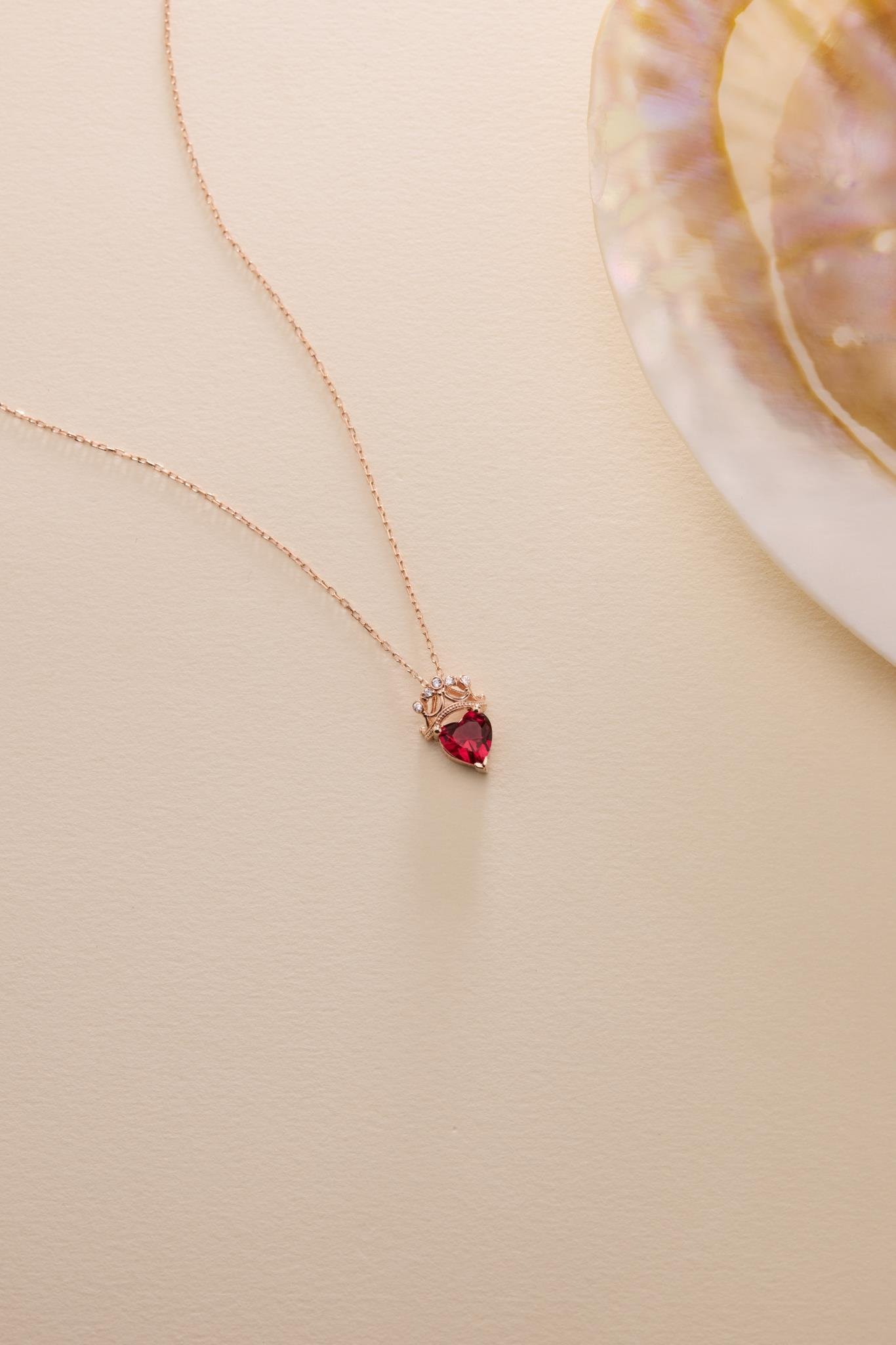 925 Ayar Gümüş Rose Kaplama Kırmızı Kalp Taşlı Kraliçe Kolye